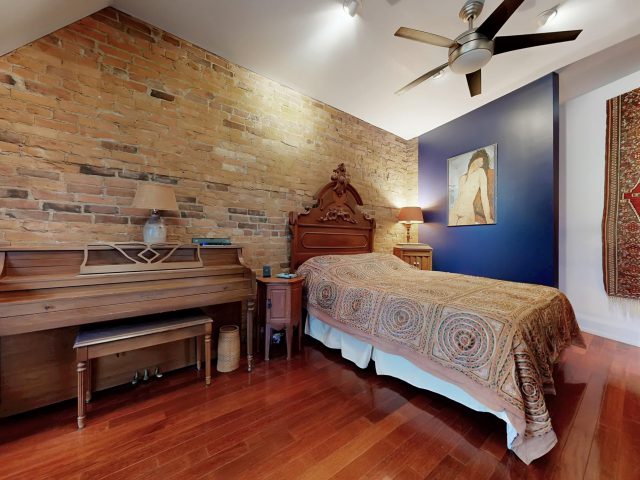 - Fantastic top floor primary bedroom with 9.5 ‘ ceilings, exposed brick, en-suite bath, steam sauna, and walk-out to roof top deck with incredible city views.